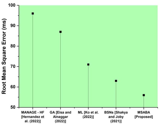 The square root of the mean of the square of all the errors is known as the root mean squared error (RMSE). The RMSE is frequently employed and is regarded as a superior all-purpose error metric for numerical forecasts. The precision of the suggested and existing methodologies is compared in Figure 9. In comparison to existing approaches, the suggested study has a substantially lower root mean square error in the healthcare monitoring system of heart disease. The root mean square error of the existing systems is as follows: MANAG- HF has a 96% root mean square level, GA has an 87% root mean square level, ML has a 71% level, and BSNs have a 63% level. The suggested system MSABA has a 56% precision level. As a result, the suggested system has the lowest level of functionality.