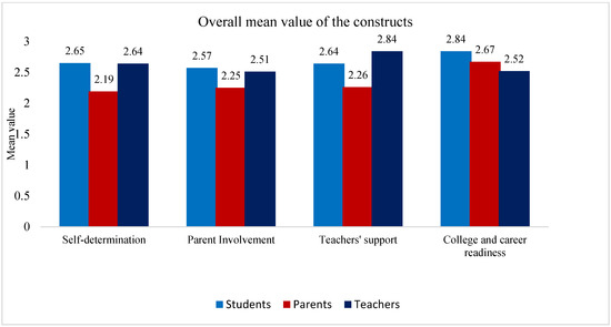 Figure 1 summarized the results for all constructs across the three groups of the respondents (students, parents, and special education teachers). Note that the difference based on the mean is negligible as all these domains are at the same level, which is reasonable. It can be observed that students (M = 2.65) and special education teachers (M = 2.64) have higher mean regarding their perception of student’s SD compared to parents’ perception (M = 2.19). Similarly, and interestingly, both students (M = 2.57) and teachers (M = 2.51) have higher mean regarding perception of PI compared to parents (M = 2.25). In addition, students (M = 2.64) and teachers (2.84) have a higher mean concerning teachers’ support compared to parents (M = 2.26). However, teachers (M = 2.52) have a lower mean compared to students (M = 2.84) and parents (M = 2.67) regarding SLDs’ CCR. It can be concluded that all three groups of respondents reported adequate level of perception regarding these four constructs, i.e., SD, PI, SETS, and CCR, but parents show lower mean compared to students and teachers in three constructs, namely SD, PI, and SET.