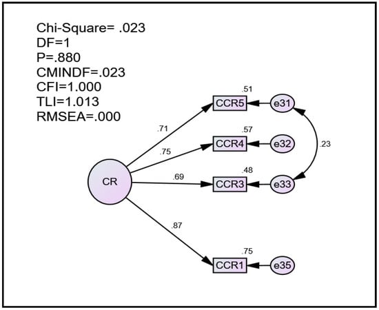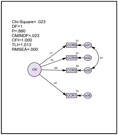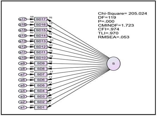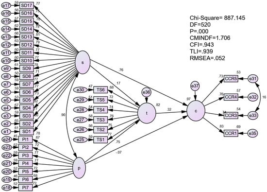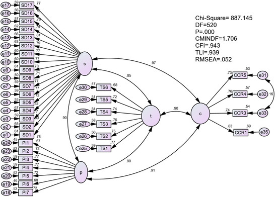 After the research data collection, that data was wrangled and coded based on the 5-point Likert scale proposed before proceeding to the statistical analysis. Missing values were not an issue because questionnaires were assigned to the respondents through Google forms which mandate every item as compulsory before answering the next item. The study used Statistical Package for Social Sciences (SPSS) version 26 to estimate the levels of the SD, PI, SETS, and CCR among SLDs in secondary schools located in Riyadh and examined the differences based on SLDs’ gender. Furthermore, co-variance-based SEM using AMOS version 26 was conducted to test the relationships between the variables and test the hypothesized model. Primarily, the confirmatory factor analysis was employed to test the psychometric properties (such as convergent validity, divergent validity, and reliability) for all constructs. Finally, the structural model was conducted to test the direct and indirect hypothesized relationship.
