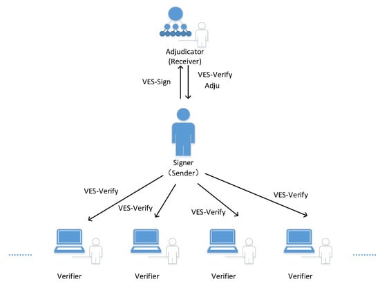 For the verifiably encrypted signature’s definition and security model, we refer to Kee Sung Kim and Ik Rae Jeong [10]. A verifiably encrypted signature scheme involves three parties: the signer, verifier, and adjudicator. The signer is responsible for generating the ordinary signature and the verifiably encrypted signature of the message, the verifier is responsible for the verification of two kinds of signatures, and the adjudicator is responsible for the ordinary signature extraction of the verifiably encrypted signature to prevent the signer’s malicious repudiation. The three parties work together to complete the following algorithms.