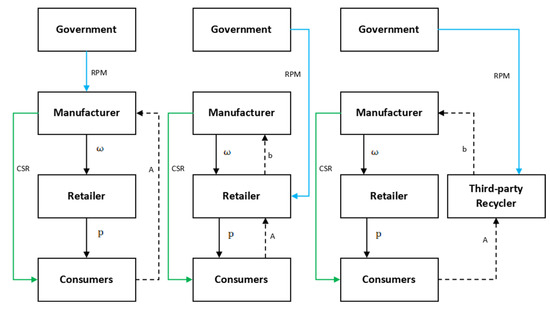 To facilitate identification, in the following formulas M refers to the manufacturer, R refers to the retailer, and T refers to the third-party recycler. According to the different member responsible for recycling, this paper studies three recycling strategies: MR strategy, RR strategy, and TR strategy. In the three recycling strategies, the manufacturer, the retailer, and the third-party recycler are responsible for recycling WEEE, respectively. The model diagrams of the three recycling strategies are shown in Figure 1.