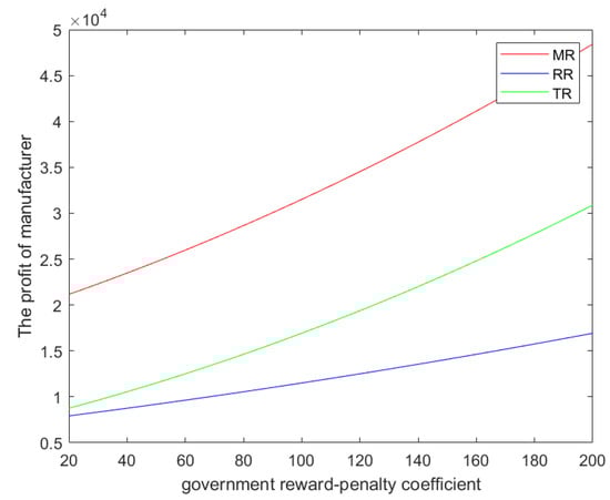 In the TR model, the optimal profit of the manufacturerincreases with the increase in the government’s reward–penalty coefficient m. The optimal profit of the retailerincreases with the increase in the government’s reward–penalty coefficient m. The optimal profit of the third-party recyclerincreases with the increase in the government’s reward–penalty coefficient m.