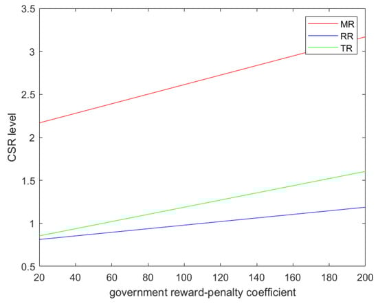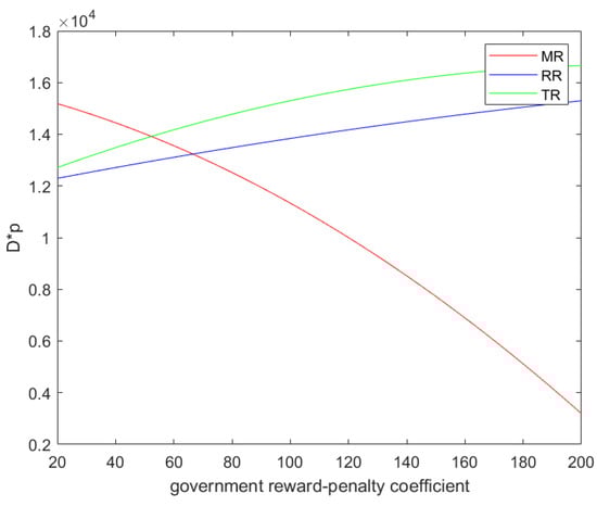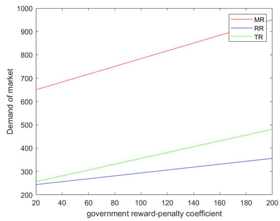 In order to analyze the results more intuitively, we assign values to the parameters. Let Q = 1000, , , , , A = 1, ,, . Figure 2 shows that with the increase in the government’s reward–penalty coefficient, the manufacturer’s optimal profits under all models increase. In the MR model, the manufacturer has the largest profit and the largest growth slope, followed by the TR model, and the manufacturer in the RR model has the lowest profit and the smallest growth slope. This result can verify Theorem 4. Figure 3 compares the CSR investment levels of CLSCs in three models. It can be seen from the figure that regardless of which recycling mode is used, the CSR investment level of the manufacturer increases with the increase in the government’s reward–penalty coefficient. The manufacturer has the highest CSR investment level in the MR model and the lowest CSR investment level in the RR model. Figure 3 verifies Theorem 5. In a numerical simulation, . It can be seen from Figure 4 that the retail price of products decreases with the increase in the government’s reward–penalty coefficient. This verifies Corollary 1, Corollary 3, and Corollary 5. Figure 5 shows that the market demand increases with the increase in the government’s reward–penalty coefficient. The market demand under the MR model is the largest, and the market demand under the RR model is the smallest. The market demand multiplied by the product retail price can be regarded as an indicator of contribution to GDP. As can be seen from Figure 6, with the increase in the government’s reward–penalty coefficient, under the MR model, the GDP contribution decreases. Under the RR model and the TR model, the GDP contribution increases.