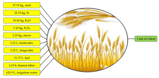 The bread production process includes wheat production, ensiling, grinding, and baking in the bakery. The studied area was the east of Golestan province, Iran. Inputs used for wheat production were the following: 189.1 kg·ha−1 of seeds, 13.5 h·ha−1 of human labor, 258.3 L·ha−1 of diesel fuel, 147.8 kg·ha−1 of N (Nitrogen fertilizer), 54.3 kg·ha−1 of K2O (Potassium fertilizer), 27.2 kg·ha−1 of P2O5 (Phosphate fertilizer), 11.2 kg·ha−1 of micro fertilizers (contains: MgO, SO3, B, Cu, Mn, Mo, Zn), 1.4 kg·ha−1 of herbicide, 1.3 kg·ha−1 of fungicide, 722.3 kg·ha−1 of manure, and 3117.1 L·ha−1 of irrigation water [11]. The inputs used to produce 1 ton of wheat were calculated and are shown in Figure 1.