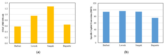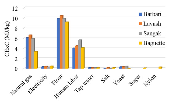 As can be seen in Figure 5, considering the functional unit of the weight of the produced bread, the CExC of Baguette bread was the lowest. Considering the functional unit of the energy of the bread, i.e., 100 cal, Barbari bread had the lowest CExC per 100 cal of embedded energy (Figure 7a). Whether it is the functional unit of weight or embedded energy of bread, Sangak bread had the highest CExC.