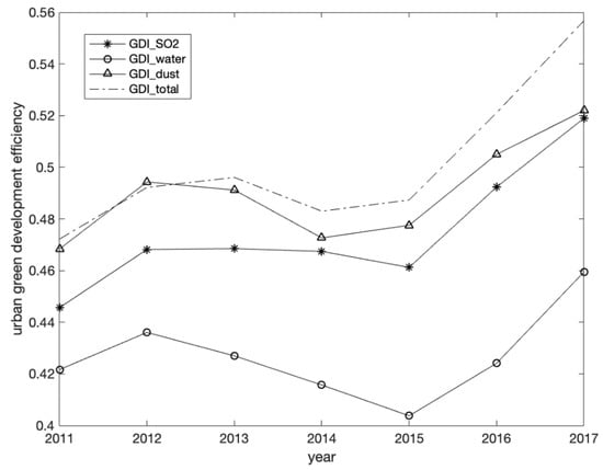 We calculated the UGDEs of the sample cities by the TNDDF, and we present the trends of the UGDEs from 2011 to 2017 in Figure 1. The UGDEs obtained from the urban industrial SO2 and industrial wastewater emissions as undesired outputs decreased in 2015, while the UGDEs obtained from the urban industrial dust and industrial total pollutant emissions as undesired outputs decreased slightly in 2014. Overall, although the UGDEs were on the rise, the average values of the UGDEs in China were between 0.422 and 0.557, which indicates that the urban green development was relatively low.