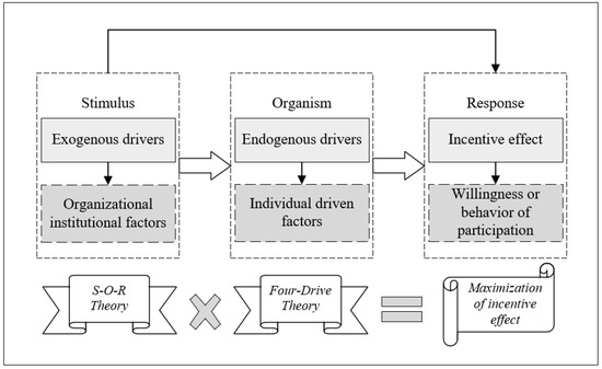 Stimulus-Organism-Response theory (also known as “behavioral learning theory”) is the main theoretical cornerstone for explaining individuals’ willingness to behave, and was first proposed by John B. Watson [22], the founder of behavioral psychology. He held the view that the basis behavior is stimulus and response, and proposed the basic S-R (stimulus-response) formula. Mehrabian and Russell (1974) [20] expanded on the S-R theory to include the study of the “organism”, and thus developed the “Stimulus-Organism-Response theory” (as shown in Figure 1). The “S” refers to the stimulus, which is the stimulus from the internal and external environment that causes the individual to respond; the “O” refers to the organism, which is the endogenous processing between the internal and external stimulus and the individual’s final response, including factors such as perception, thinking and emotion; and the “R” refers to the response, which is the endogenous processing between the endogenous and exogenous stimulus and the individual’s final response. “R” is the response, which is the result of this process and is formed by the object of the stimulus. According to the S-O-R model, when an organism is subjected to an internal or external stimulus, it affects the individual’s emotions and cognition, which in turn leads to a tendency towards, or avoidance of, behavior. Accordingly, we believe that the organizational factors that motivate the public’s active involvement in grass-roots social governance have an impact on the public’s behavior and their willingness to be involved in grass-roots social governance by satisfying individual drivers; for example, the more the organizational incentive system can satisfy the public’s needs and motivations, the higher the incentive effect will be on the public.