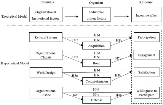 Combined with Nitin Nohria et al.’s [25] study, we argue that to incentivize the public’s active involvement in grass-roots social governance, the organizational institutional factors refer to the strategies and organizational climate developed by the government and grass-roots self-governance organizations, including the four aspects of reward system, organizational climate, work design and organizational justice. The individual driven factors refer to the four drives of the public, including acquire, bond, comprehend and defend. The theoretical framework of the study is shown in Figure 2. We define “organization”, in this context, as the organization through which the public is involved in grass-roots social governance, which is divided into government and grass-roots self-governance organizations; these are represented by villagers’ committees, villagers’ representative committees, community residents’ committees, neighborhood committees, residents’ representative committees, women’s representative committees, etc. The factors and indicators of the incentive effect are explained in detail below, and the research hypotheses of this paper are formulated accordingly.