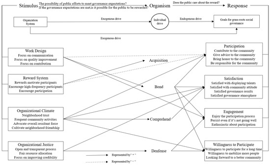 This study takes the Stimulus-Organism-Response Theory as the core, combines the Four-Drive Theory to build a theoretical framework, takes organizational institutional factors and individual driven factors as stimulating factors for the public’s active involvement in grass-roots social governance, and measures the response degree of the public’s active involvement in grass-roots social governance with incentive effect, and builds a hypothetical model to encourage the public to be involved in grass-roots social governance, and makes an empirical test with 428 members of the public who have worked in grass-roots social governance as samples. According to the empirical results, we draw the incentive mechanism chart of the public’s active involvement in grass-roots social governance. The results show that, for the members of public who have worked in grass-roots social governance, exogenous organizational drivers will have incentive effect to their active involvement in grass-roots social governance by acting on endogenous individual driven factors. The specific influence path is shown in Figure 8. Work design has a positive and indirect impact on participation, engagement, satisfaction and willingness to participate through comprehension drive mediation, and will have a negative and direct impact on participation. Reward systems only have a negative direct impact on participation. Organizational climate has a positive and indirect impact on satisfaction through bond drive mediation, and also has a positive and direct impact on participation, satisfaction and willingness to participate. Organizational justice has a positive and indirect impact on engagement through defense drive mediation, and also has a positive and direct impact on satisfaction.