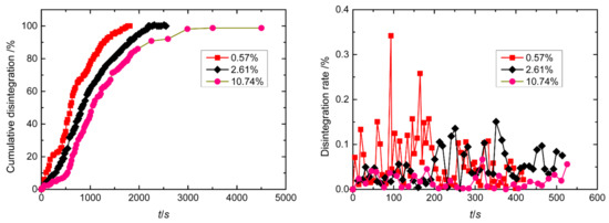 To sum up, for the influence of the initial moisture content of the undisturbed soil on disintegration, a relatively unified research result is that there are roughly three stages in the disintegration process: slow disintegration in the initial stage, rapid disintegration in the middle stage and slow disintegration in the later stage. The disintegration curve roughly presents a tilt “S”-shaped curve. If the initial water content is lower, the disintegration is stronger, the disintegration rate is faster and the destruction phenomenon is more significant.