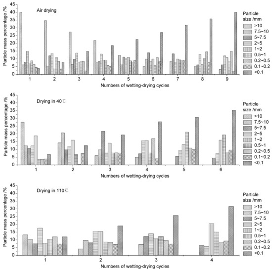 In one study, when the temperature increased from 30 °C to 50 °C, amorphous iron gradually crystallised (aged) and formed a firm cemented connection. The reduction in the hydroxylated surface of amorphous iron slowed down the activity of the soil and led to soil disintegration [53]. Tang et al. (2011) indicated that the emergence of a large number of fractures caused by temperature changes was the main reason for the accelerated disintegration of basalt residual soil [42]. At a certain temperature, with an increase in the number of unsaturated-saturated cycles, the damage variable on saturated granite residual soil gradually increases at first and then becomes stable. Zhang and Kong (2016) believed that repeated dry-wet alternation caused by high temperatures and humid climates would destroy particle agglomeration and enhance the dispersion of soil [54]. In their study, the disintegration rate increased with the increase in the number of dry–wet cycles, and the disintegration was dominated by coarse particles and gradually changed to fine particles. The higher the temperature and the more dramatic the climate change, the more significant the effect (Figure 5). Guo (2017) found that the mineral activity of red soil was greater at a high temperature, and the disintegration phenomenon was more obvious [55]. The disintegration rate was the slowest when the temperature was 20 °C, and complete disintegration occurred quickly when the temperature was 60 °C. These research results are consistent with those of Tang (2005). Huang et al. (2017) indicated that under different temperature conditions, the damage variable increased after five cycles, which was similar to the change rule of cohesion [47]. However, Zeng et al. (2018) found that the disintegration of red clay increased with the increase in temperature, but the disintegration of red clay was not sensitive to temperature in the natural environment [48].