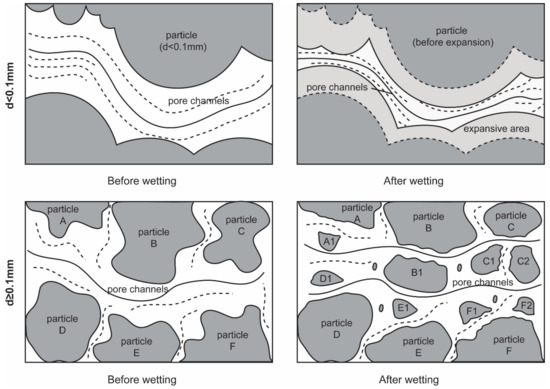 The importance of “water” in soil disintegration can be found in the definition of the concept of soil disintegration by many scholars. In fact, the study of water-soil interaction has never stopped in the development of soil mechanics and has always been a hot spot [23,24,25,26,27]. The influence of water on soil disintegration characteristics is mainly based on three aspects: the initial moisture content in undisturbed soil, the dry-wet cycle and the moisture content of remoulded soil.