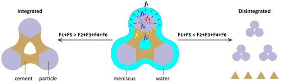 The action mechanism of the cross factors is as follows: Usually, red soil is in an unsaturated state, and the internal pores are relatively developed. Due to the influence of the matric potential, its water absorption capacity is strong. Under conditions such as rainfall (water), water gradually intrudes into the soil, dissolves some of the cementation between particles (mineral composition) and compresses the air in the pores to produce pore gas pressure (suction). Due to the effect of the expansive force generated by pore gas pressure and the expansive force generated by mineral composition, the size and order of soil particles (microstructure) change greatly [95]. When water enters unevenly into pores or fissures, the rate of thickening in the intergranular diffusion layer is not uniform, so the repulsive forces exceed the suction in different places between the grains, which causes the soil to disintegrate along the surface where the repulsive forces exceed the maximum suction. When the soil goes through the dry-wet cycle or the action of the acid solution, the soil disintegration phenomenon is more obvious. The factors affecting disintegration can be divided into external inducible factors and internal sensitive factors. The external inducible factors mainly include water, temperature, acid and basicity. The internal sensitive factors mainly include suction, mineral composition and microstructure. Under the combined action of internal and external factors, the soil mass disintegrates. From the perspective of mechanics, the soil is mainly affected by shrinkage film envelopment force, f1; expansive force, f2, generated by mineral composition; buoyancy force, f3; expansive force, f4, generated by gas pressure; cementation force, f5; and gravity force, f6, as shown in Figure 10. When F1 + F5 > F2 + F3 + F4 + F6, that is, the anti-disintegrating force is greater than the disintegrating force, the soil sample remains intact and does not disintegrate. When F1 + F5 < F2 + F3 + F4 + F6, that is, the anti-disintegrating force is less than the disintegrating force, the soil sample maintains integrity and disintegrates [95].
