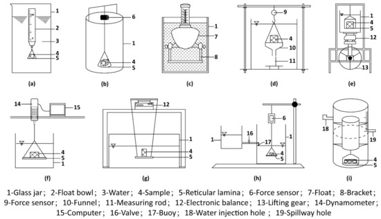 Since Jiang et al. (1995) proposed the buoy-type soil disintegration tester [96] (Figure 11a), many researchers have improved the disintegration test device to varying degrees in order to carry out more accurate quantitative research (Figure 11b–i). However, the low accuracy led to different research results and even some contradictory conclusions. The experimental study of the soil disintegration effect is still in the primitive stage of discussion. At present, the main quantitative research methods for red soil disintegration are the buoy method (Figure 11a,c,i) and the mass method (Figure 11b,d–h). For the buoy method, the volume of the displacement liquid decreases with the rise of the buoy, so it is difficult to obtain an accurate scale value of the water level in the test process. There are two main problems: first, the soil disintegration amount needs to be converted by the scale line reading; second, the inner cylinder will float up and down when there is a large of instantaneous disintegration. This makes the readings unstable and prone to errors. For the mass method, the process of placing the sample in water will disturb the water balance and affect the reading precision, which makes it difficult to obtain the initial value.