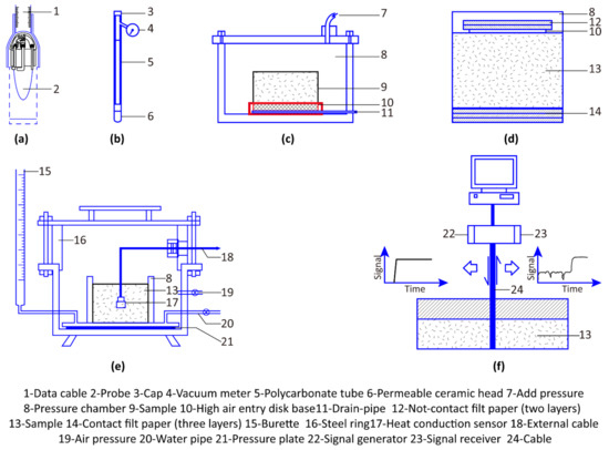(a) Thermocouple soil psychrometer [146]; (b) tension meter [179]; (c) operation principle of pressure plate apparatus [164]; (d) filter paper method [48,167,169,170,171]; (e) heat conduction sensing method [174,175,176]; (f) basic principles of the TDR system [177,178].
