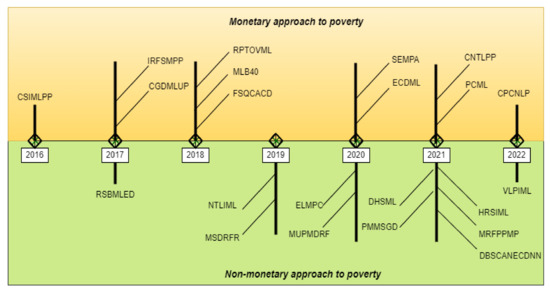 Figure 3 provides more detailed information on publications across the years, in which publications were categorized into two types in accordance with the applied approach to poverty measurement. Thus, above the line, papers where monetary approaches to poverty were considered are listed, whereas the papers shown below the line belong to a non-monetary poverty approach. In this figure, it can be seen that the distribution of poverty approaches among papers was equal. Yet, an interesting tendency can be observed when the initial analysis was conducted using the monetary approach to poverty, but as time passed, the non-monetary approach prevailed in poverty prediction via AI applications.