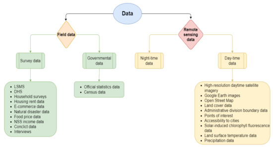 This work is a revolutionary study in predicting poverty from high-resolution satellite imagery [14]. As poverty measurements, consumption expenditure and asset wealth were chosen. Analyses were conducted using satellite data, and the Living Standards Measurement Study surveys five countries: Nigeria, Tanzania, Uganda, Malawi, and Rwanda. To measure household expenditures, authors used Living Standards Measurement Study (LSMS) surveys, whereas for wealth measurement, they used an asset index drawn from the Demographic and Health Surveys (DHS). Both these indicators were outcomes of the model.
