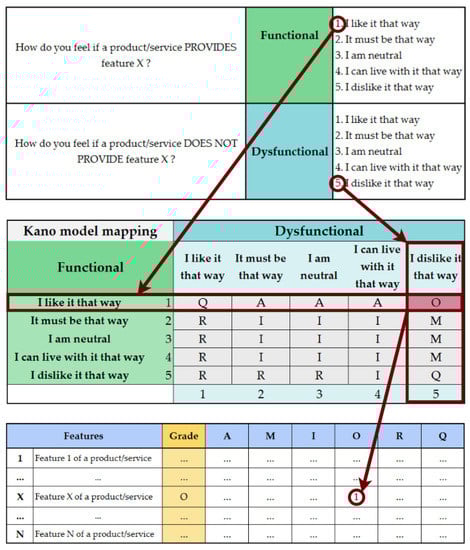 The Kano evaluation process illustrated in Figure 2 shows that the first step is to formulate two questions for each feature proposed for a new product or service to capture the reaction of a potential customer to the existence (functional question) or absence (dysfunctional question) of that feature. Each potential customer should answer both questions by rating their reaction using the following options: “I like it that way”, “It must be that way”, “I am neutral”, “I can live with it that way”, and “I dislike it that way”. The evaluation of each potential customer reaction is analyzed on the basis of the pair of reactions (functional, dysfunctional).