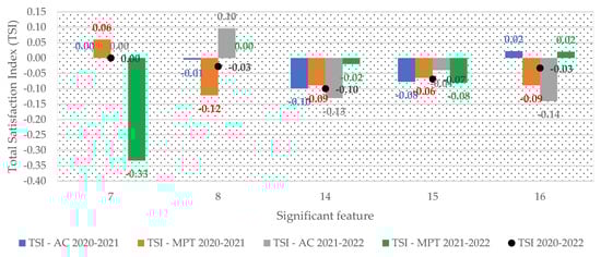 A general overview of the proposed product or service is determined by computing the total satisfaction index (TSI), defined in Equation (3) [18]. This will provide a more accurate overview of the features that deserve investment in the development stage and should be present in the final product or service. Negative results indicate that the lack of those features will bring dissatisfaction to the potential customer, while positive results are related to the features that will provide satisfaction through their presence. Following this approach, the features with higher TSI values yield a greater impact.