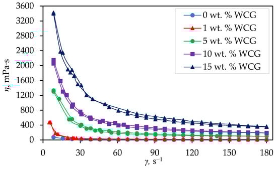 - From the obtained diagrams of the dependence of apparent viscosity (η, mPa s) on shear rate (γ, s−1), it is evident that samples with 0 wt. % waste coffee grounds at a shear rate of 50 s−1 have viscosity values of 11.8 mPa s, while samples with 15 wt. % of waste coffee grounds at a shear rate of 50 s−1 have values of around 967.6 mPa s, from which it can be concluded that increasing the waste coffee ground amount also increases the apparent viscosity.