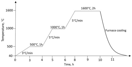 First, heating to 500 °C with a heating rate of 3 °C∙min −1 and 1 h holding time at 500 °C, which enabled the organic material to burn out. Next, the samples were heated to 1000 °C with a heating rate of 5 °C∙min−1 and 1 h holding time at 1000 °C, allowing carbonaceous residuals to burn out and gas out. Following this, the samples were heated to a sintering temperature of 1600 °C at a heating rate of 5 °C∙min−1 and 2 h holding time at 1600 °C. After the cooling of the furnace, the sintered samples were removed for further characterization.