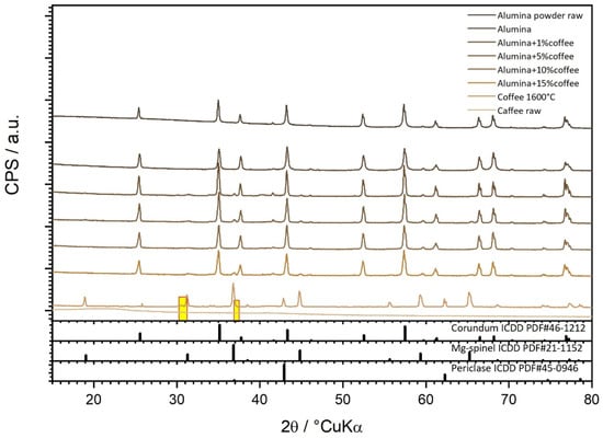 The results for the PXRD of Al2O3 powder raw and alumina ceramic samples with different amounts of waste coffee grounds (WCG) (0 wt. %, 1 wt. %, 5 wt., 10 wt. and 15 wt. %), WCG raw, and WCG thermally treated at 1600 °C, are shown in Figure 4. The XRD analysis shows that raw WCG is amorphous. The XRD for thermally treated coffee shows Mg-spinel (ICDD PDF#21-1152) and magnesium oxide periclase (ICDD PDF#45-0946) crystallize (Figure 4). These are high-temperature phases that can withstand the high-temperature thermal treatment and are, therefore, concentrated as organic phases are burned out of the sample. A minor calcium phosphate phase (ICDD PDF#09-0348) is visible in the XRD (Figure 4, marked yellow).