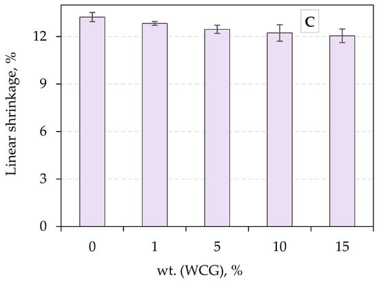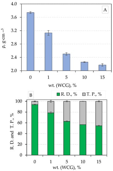 Figure 5A,B shows the values of obtained density (ρ, g cm−3), relative density (R. D., %) and total porosity (P, %). Figure 5C shows the results of shrinkage (S, %) of the various Al2O3/WCG ceramics.