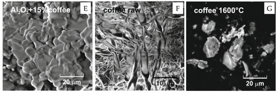 By analyzing the obtained microstructure data shown in Figure 6A–E, it can be observed that the microstructure porosity increases with the increase in the amount of WCG. This is to be expected, considering that WCG is used as a pore-forming agent. From the morphology point of view, SEM micrographs show the grainy appearance and relatively dense packing, typical of alumina bodies (Figure 6). With the increase in coffee content, the only element that appears to change is the grain size distribution. The addition of coffee changes the overall uniformity and monomodal size distribution of pure alumina to a broader distribution. The grains seem to be of a similar shape. Such a phenomenon is in line with the burn out of the organic phase. For the case of WCG (Figure 6F), SEM shows networked amorphous matter, while for the case of thermally treated WCG (Figure 6G), the inorganic constituents of WCG remain, forming clearly formed irregular agglomerated particles with a crystalline appearance.