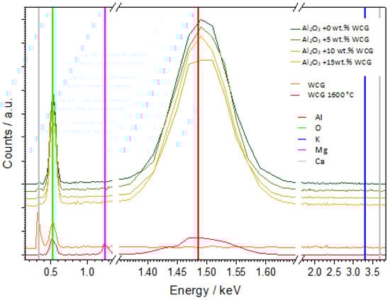 Figure 7 presents EDS spectra of Al, O, K, and Mg of Al2O3 powder raw, alumina ceramic samples with different amounts of WCG (0 wt. %, 1 wt. %, 5 wt., 10 wt. and 15 wt. %), WCG raw, and WCG thermally treated at 1600 °C.