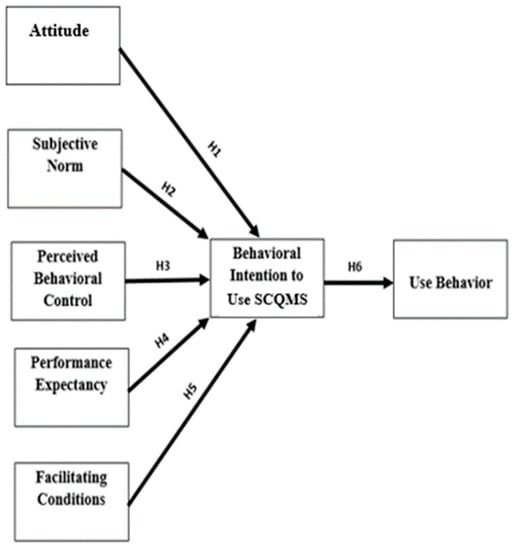 On the other hand, other researchers argue that subjective norms are still required for predicting individuals’ intentions [68,69,70,71]. When Armitage and Conner [72] used multiple-component measurements, they discovered a substantial link between subjective norm and intention. Additionally, the subjective norm has been proven to be an enabler for behavioral intention measurements [73]. As a result, it is proposed that subjective norm positively influences behavioral intention to use SCQMs.