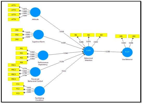 Table 6 presents the outcomes of the hypotheses that were tested. The results indicate a strong positive effect for four hypotheses H3, H4, H5, and H6, while H1 and H2 are not supported. Consequently, H1 the results for attitude are (β = 0.018), T-Value (0.435) and p > 0.05. This result refers to the rejection of the proposition. Therefore, H1 is not supported, and attitude has no positive impact on behavioral intention to use SCQMS. H2 the results for subjective norm are (β = 0.028), T-Value (0.698) and p > 0.05. This result refers to the rejection of the proposition. Therefore, H2 is not supported, and the subjective norm has no positive impact on behavioral intention to use SCQMS. H3 the path coefficient for perceived behavioral control is (β = 0.150) and has a value of (T-Value = 3.027) at a significant level of (p < 0.05). This outcome refers to the acceptance of the hypothesis. It could be concluded that there is a positive effect of perceived behavioral control on behavioral intention to use SCQMS. H4 the path coefficient for performance expectancy is (β = 0.540) and has a value of (T-Value = 15.904) at a significant level of (p < 0.05). This outcome refers to the acceptance of the hypothesis. It could be concluded that there is a positive effect of performance expectancy on behavioral intention to use SCQMS. H5 the path coefficient for facilitating condition is (β = 0.112) and has a value of (T-Value = 2.003) at a significant level of (p < 0.05). This outcome refers to the acceptance of the hypothesis. It could be concluded that there is a positive effect of facilitating conditions on behavioral intention to use SCQMS. H6 the path coefficient for behavioral intention is (β = 0.356) and has a value of (T-Value = 8.944) at a significant level of (p < 0.05). This outcome refers to the acceptance of the hypothesis. It could be concluded that there is a positive effect of behavioral intention on use behavior.