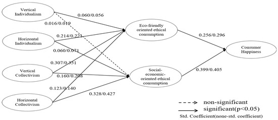 To test the structural relationships in the model, the hypothesized causal paths were estimated. The results are shown in Table 5 and Figure 2, and they indicate that VI as a component of cultural values did not affect socioeconomic-oriented ethical consumption (γ = 0.016, p = 0.621). However, VI as a component of cultural values has positive effects on eco-friendly ethical consumption (γ = 0.016, p = 0.621). Thus, H2-1 was rejected, but H1-1 was supported. These results indicate that vertical/horizontal individualism and collectivism were shown to be significantly positively associated with eco-friendly and socioeconomic-oriented ethical consumption. Thus, H1-2, 1-3, 1-4. 2-2, 2-3, and 2-4 were supported. Eco-friendly-driven and socioeconomic-oriented ethical consumption have positive effects on consumer happiness. Thus, H3 and H4 were supported.