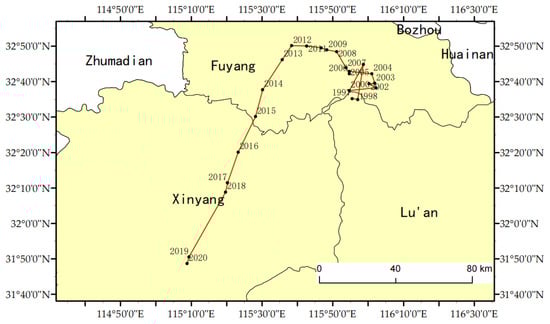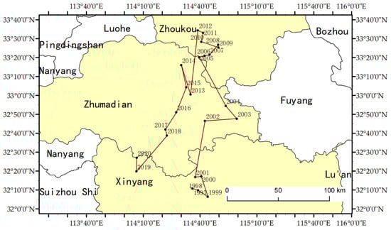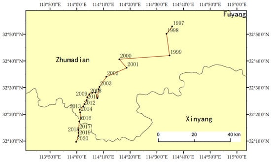 When the attribute value is changed into the GDP per capita, the migration map of China’s economic center of gravity based on per capita GDP (ECGP) is as shown in Figure 4. With the per capita GDP as an attribute value, the ECGP of China from 1997 to 2020 falls in Xinyang City, Zhoukou City, and Zhumadian City in Henan Province. Among them, China’s ECGP was in the territory of Xinyang City from 1997 to 2001, it was in the territory of Zhumadian City from 2002 to 2005, and then the ECGP moved to the territory of Zhoukou City from 2006 to 2012. It moved in the opposite direction and returned to Zhumadian City again from 2013 to 2020, then entered Xinyang City after 2019, with a trend of going north in 2020.