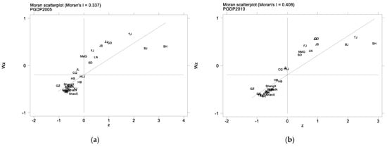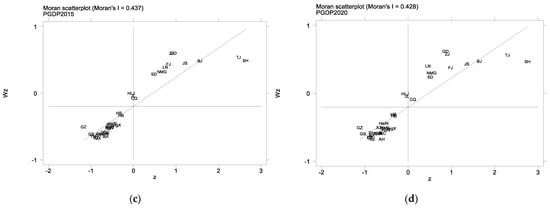 The global Moran index only grasps the spatial autocorrelation of variables as a whole and cannot identify the spatial agglomeration of a region. With the help of Moran’s I scatter plot, the spatial dependence of the economic growth in each province can be more intuitively presented []. Due to space limitations, in this paper, we selected the representative years as 2005, 2010, 2015, and 2020 to list Moran’s I scatter plot of economic growth, as shown in Figure 5. According to the Moran scatter chart of each year, the economic growth of each region from 2005 to 2020 is more evenly located in the regions of the first and third quadrants, suggesting that the economic growth of most provinces and cities has a positive spatial spillover effect on the neighboring provinces.
