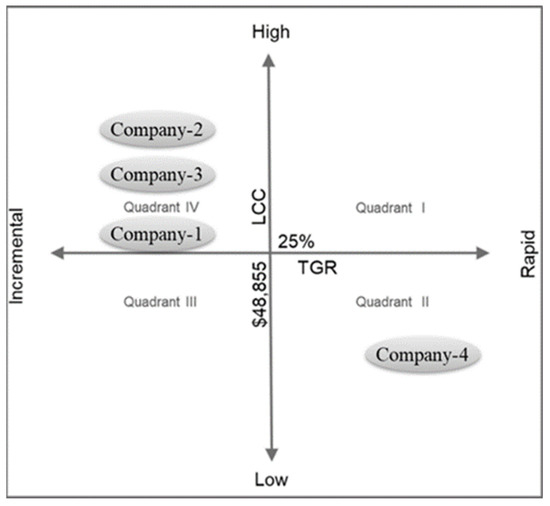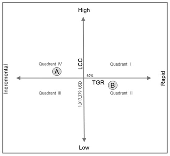 Description—The Four-quadrant model consists of LCC on the y-axis, and TGR on the x-axis, as shown in Figure 2. The base value (point of intersection of axis) is the mean value of the LCC and TGR of all the alternatives. The values of LCC and TGR of each alternative are substituted in the four-quadrant model, with reference to the base value. The values of LCC are given in the range of high to low, and the values of the TGR—being rates—are given in the range of incremental to rapid, for a better understanding of the model.