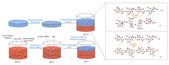 Due to the unique 3D network and hydroxyl-rich groups of BC, a variety of macromolecules can be embedded in its self-assembly matrix through an in situ biosynthesis process that lacks severe conditions []. The additional hydrogen bonds created between the cellulose microfibrils and the macromolecular additives help to produce a modified 3D cellulose network with an effective nanoparticle dispersion rate. Therefore, the yield, structure, and properties of BC can be adjusted and improved [] to create effective, in situ modifications [,]. A recent study demonstrated that the in situ BC, modified by xylan and xyloglucan added to the culture media, exhibited better thermal stability and tensile properties []. In another study, potato starch in the medium produced a nontoxic and biodegradable in situ composite BC hydrogel, demonstrating its in vivo implantation potential for tissue engineering []. Both sodium alginate (SA) and sodium hyaluronate (SH) are natural polysaccharides []. SA has been demonstrated to promote cell delivery in tissue engineering []. In previous studies, SH also displayed broad prospects for biomedicine in hydrogel systems []. However, although studies on BC modification are common, comparative studies of composite BC hydrogels with different macromolecules are limited.