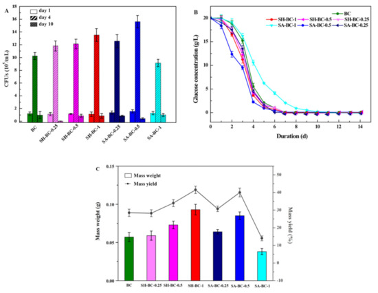 Biosynthesis of the native BC and the composite BC hydrogels (SH-BC-0.25, SH-BC-0.5, SH-BC-1, SA-BC-0.25, SA-BC-0.5, SA-BC-1): CFU number (A), glucose consumption (B), and mass weight and yield of the cultivation time in days (C).