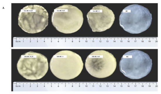 Digital photographs of BC, SA-BC-1, SA-BC-0.5, SA-BC-0.25, SH-BC-1, SH-BC-0.5, and SH-BC-0.25 (A); SEM images of BC, SA-BC-0.5, and SH-BC-1 (B).