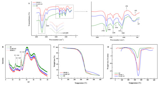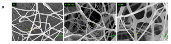 The FTIR spectrum of the native BC in Figure 4A shows that the peak at 1060 cm−1 was attributed to the C–O stretching of the primary alcohol. The absorption peaks at 1316 and 1430 cm−1 were due to wagging symmetric bending and symmetric bending of CH2, respectively, and the peaks obtained for the asymmetric stretching of C–O–C and stretching of C–H were at 1161 and 2919 cm−1, respectively [,]. The peak at 1750 cm−1 was attributed to C=O vibration and the absorption peaks at 622 and 417 cm−1 corresponded to –COO– asymmetrical and symmetrical stretching vibrations, respectively []. A broad peak at 3400 cm−1 was ascribed to O–H stretching and 1641 cm−1 was the glucose carbonyl of cellulose []. After adding the macromolecular compounds into the medium, a weakened peak appeared at 1750 cm−1, while the peak at 622 cm−1 was blunter, and that at 417 cm−1 was sharper. The shifting of the peak to a lower wavenumber region emerged at 2919 cm−1. In the SH-BC-1 hydrogel spectrum, the absorption peak at 1161 cm−1 was pronounced differently compared with that of the native BC. This illustrates that SH deposition on the BC surface created complex crosslinking during the in situ process. The crosslinking behaviors of SH and BC were also confirmed by the peak at 870 cm−1 (N–H bending) []. In the SA-BC-0.5 hydrogel spectrum, the intensity difference of the peak at 1641 cm−1 demonstrated that binding reactions occurred between SA and BC. Compared with the spectrum of the native BC, the broad and pronounced peaks of a typical red-shift hydrogen bond at 3000–4000 cm−1 suggested that the BC could form intermolecular hydrogen bonds with SA or SH [].