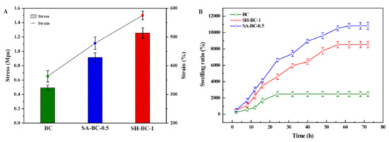 Additionally, the SEM images show that the composite BC hydrogels have a network structure with a porous interior, which indicates that there is great potential for improving their SR. The swelling behaviors of the hydrogels also reflect the absorptive capacity of the hydrogel material to the medium under certain physiological conditions []. As a biomaterial, the improved swelling property was accompanied by an increased surface area and enhanced nutrient transport []. The SR of the hydrogels after being immersed in a 7.4 pH buffer solution is displayed in Figure 5B. The composite hydrogels of SA-BC-0.5 and SH-BC-1 swelled quickly during the first 16 h. One explanation for this is that contact with water molecules could take place in a relatively short time due to the interconnected pore structure of the composite hydrogels combined with their increased internal specific surface area []. It is worth noting that, for the composite hydrogels, the maximum SR of SH-BC-1 at equilibrium was 8603%. The SR of SA-BC was the highest, with a maximum value of 10,831% for the medium with 0.5% SA concentration. The swelling capacity of SH-BC-0.25, SH-BC-0.5, SA-BC-0.25, and SA-BC-1 hydrogels with equilibrium SRs of 7673%, 7976%, 8347%, and 2603%, respectively, are shown in Figure S3 in the Supplementary Materials. When 1% SA was added, the formed linear structure made the hydrogel lose its advantage during its swelling behavior. However, the native BC exhibited a lower SR of 2326% and attained the equilibrium state within 20 h, while the composites of SA-BC-0.5 and SH-BC-1 required approximately 62 h to attain the swelling equilibrium state. This difference in swelling behaviors can be attributed to: (a) the increase in the hydrophilic groups of –COOH in the composite hydrogel chains due to the optimum dose of SA or SH, and (b) the interactions between BC and SA or SH through hydrogen bonds, leading to the denser network of the composite hydrogel (as shown in Figure 3B). The results provide further evidence that the two macromolecules of SA and SH firmly bonded, respectively, in the network structure of the native BC. This good swelling property offers an advantage for biomedical applications. In addition, Yin et al. evaluated the mechanical and swelling properties of the modified BC composite membranes and came to the conclusion that the BC composite membrane with better mechanical properties performed superior swelling capacity, indicating the certain potential for in-depth follow-up research [].
