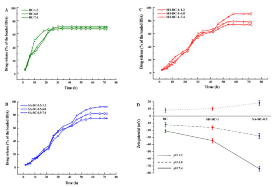 Profiles of the in vitro drug release efficiency (A) BC, (B) SA-BC-0.5, (C) SH-BC-1, and (D) zeta potential.