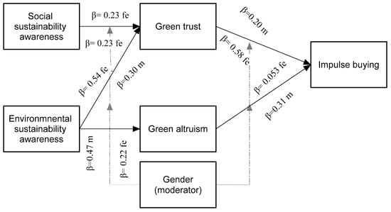 Researchers have identified gender as an important mediator variable for impulse buying motives [58]. We incorporated gender as a key moderator variable in the current study to fill the research gap. Because it is so important, it plays a vital role in influencing the relationship between sustainability practices and impulse buying. Furthermore, Parsad et al. [36] stated that gender is directly linked with impulse buying. From a psychologist’s point of view, every single individual keeps a unique tendency to adopt and act impulsively. Numerous research studies on the impulse buying behavior of consumers indicate that buyers usually differ in their liking of impulse buying [19]. It has been proven that in purchasing luxurious products, women have been found as more impulsive buyers than men [37]. According to social role theory, generally, women focus more on the economic benefits of purchasing products than men [59]. In addition, women are more conscious, referencing and assessing the prices and rewards of products when they are engaged in impulse buying activities [42].