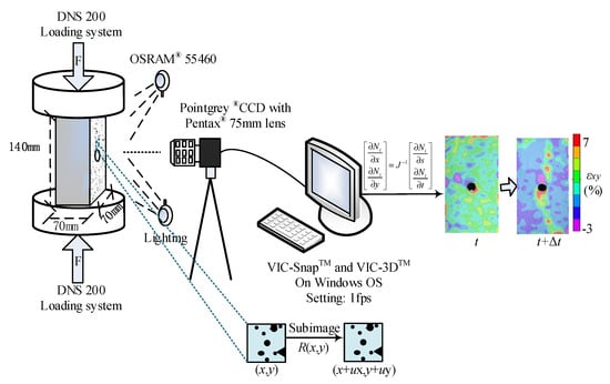 The testing system consisted of a loading system and a digital image observation system as shown in Figure 1. The loading system was a DNS-200 electronic universal testing machine (Changchun Machinery Research Institute Co., Ltd., Changchun, China), which can be used for laboratory testing of non-metallic materials. The tests were conducted under uniaxial compression, which was through displacement-controlled loading at a loading rate of 0.05 mm/min, and the loading was continued until the sample failed. The digital image observation system consisted of image acquisition and processing devices. This system can collect the images of the surface of the sample in real time, store the image in the disk in digital form, which was used to calculate the full-field strain, and output it with a matrix.