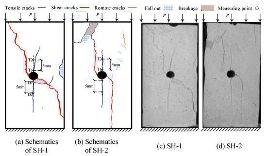 Three basic types of cracks, namely, tensile cracks (T), shear cracks (S), and remote cracks (R), were observed during the deformation and fracturing of the samples containing holes under pressure as shown in Figure 2. The failure mode was shear failure, and the specific failure processes were as follows. The initial tensile cracks first appeared in the upper and lower ends of the hole boundary but did not propagate to the edge of the sample. Then, shear cracks occurred on the left and right sides of the hole boundary, and remote cracks (essentially tensile cracks) appeared at the remote end of the hole boundary. With continuous loading, the initial shear cracks propagated and coalesced with the remote cracks to form macroscopic shear failure cracks, resulting in diagonal shear failure. This finding is consistent with the result of the progressive fracturing process [2,41]. However, we found that there was another type of crack where the remote cracks and shear cracks merge and that the formation of such cracks is caused by the combined action of the tensile stress and shear cracks [42]. This phenomenon has been discussed in the research related to fracture coalescence [51].
