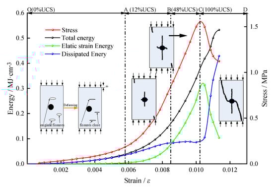 In the decelerated energy dissipation stage, the deformation of the sample increases. The original fissures and the new micro-fissures gradually close, causing the effective contact area inside the sample and the accumulation rate of the elastic strain energy to increase and causing the growth rate of the dissipated energy to gradually decrease. However, the dissipated energy is still larger than the elastic energy in section AB, indicating that some of the micro-fissures reopen. When the loading reaches 48% of the peak stress, the dissipated energy is still greater than the elastic energy. This phenomenon differs from the energy conversion of intact homogeneous samples of coal, sandstone, and granite [53]. This phenomenon is noteworthy and was analyzed in detail in this study. In previous studies [54,55], it was found that after the compaction stage, localized concentration occurs at the upper and lower ends of the hole boundary under tensile stress. According to the maximum tensile strain criterion, it is concluded that micro-fractures are formed in the upper and lower regions around the hole, but they have a low density and do not nucleate to form macroscopic failure cracks. Thus, it is concluded that the dissipated energy is greater than the elastic strain energy before 48% of the peak stress is reached due to the continuous development and migration of micro-fissures in the upper and lower regions around the hole.