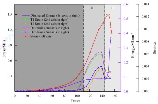 Dissipated energy and deformation of SH-1 during the uniaxial compression test. I: Slow rise stage of horizontal strain; II: Rapid change stage of horizontal strain; III: Smooth stage of horizontal strain.