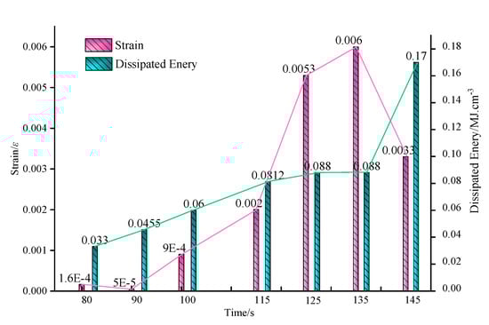 The initial tensile cracks essentially had no influence on the macroscopic failure mode of the samples containing holes. The above analysis shows that the amount of dissipated energy released was closely related to the propagation of the tensile cracks. Figure 5 compares the tensile cracks and dissipated energy. At the end of the compaction stage, as the dissipated energy increased, the initial tensile micro-cracks continuously initiated, developed, and opened, and thus, the transverse strain of the initial tensile cracks increased continuously. From 115 s to 125 s, the dissipated energy increased slightly, and the horizontal strain of the tensile cracks increased rapidly, indicating that the generated dissipated energy was all used for the development of the tensile cracks. From 125 s to 140 s, the dissipated energy only changed slightly, and the growth rate of the horizontal strain of the tensile cracks slowed down. This occurred because the dissipated energy was also used for the initiation and development of the cracks to the left and right sides of the hole (subjected to compressive shear stress) and the remote cracks. In addition, this also shows that after the loading reached a certain extent, the energy input into the sample by the testing machine was mainly stored in the sample in the form of elastic energy, which is also applicable to samples containing pores. Therefore, the generation of remote cracks and cracks to the left and right of the hole boundary inhibited the propagation of the tensile cracks, corresponding to the closed state in this stage. Subsequently, when the energy storage limit was reached, the elastic strain energy stored around the hole was released, and the macroscopic failure cracks propagated and coalesced, causing the stress environment to change. At this time, the initial tensile cracks, which were previously in a closed state due to inhibition, propagated again and finally formed tensile cracks.