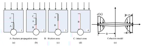 The tensile cracks in the upper and lower ends of the samples containing holes experienced an opening–closing–reopening process. The presence of cohesion c(x) hindered the propagation of the tensile cracks, which were formed by the generation and migration of the fracture propagation zone, friction zone, and intact zone.