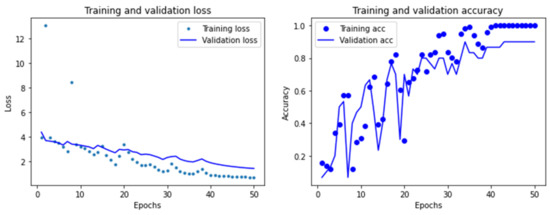 The data set used in this experiment is the same as it was in the previous one, so the associated preprocessing work will not be repeated. Figure 15 displays the outcomes of the training set and test set. The new model has good generalization ability, according to an analysis of the classification accuracy data on the right. The classification accuracy has increased from the initial 6.67% to the final 90% after 50 training sessions. The classification accuracy of the model on the test set essentially stayed in the range of 86.67% to 90.00% over the course of the last 10 training sessions before stabilizing at 90.00%. The new model fits the data better than the conventional VGG16 model, effectively avoiding the over-fitting issue, and significantly increasing prediction accuracy. The overall loss function value of the model exhibits a monotonically decreasing trend, according to the analysis of the loss function value data on the left. The 50th value for the function was 1.4301. Although the convergence effect is not ideal, the convergence trend is significantly more significant than the previous network. This necessitates further fine-tuning of the model’s hyperparameters. It should be noted that the dropout layer introduced in this paper effectively filters out the impact of outliers on the loss function value.