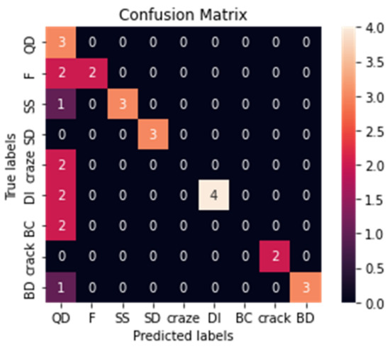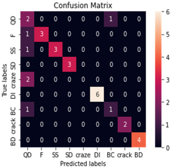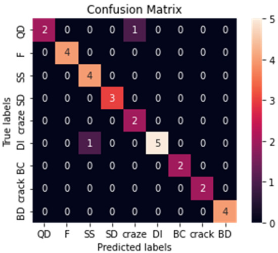 The network exhibits good robustness in the classification and prediction of eight types of defect images and qualified images of plastic components, Figure 20 shows the final classification results. The improved VGG16 does not mistakenly classify original defective plastic components as qualified plastic components, allowing for high-quality mold fault diagnosis. This is revealed through the analysis of the confusion matrix created by this most recent network.